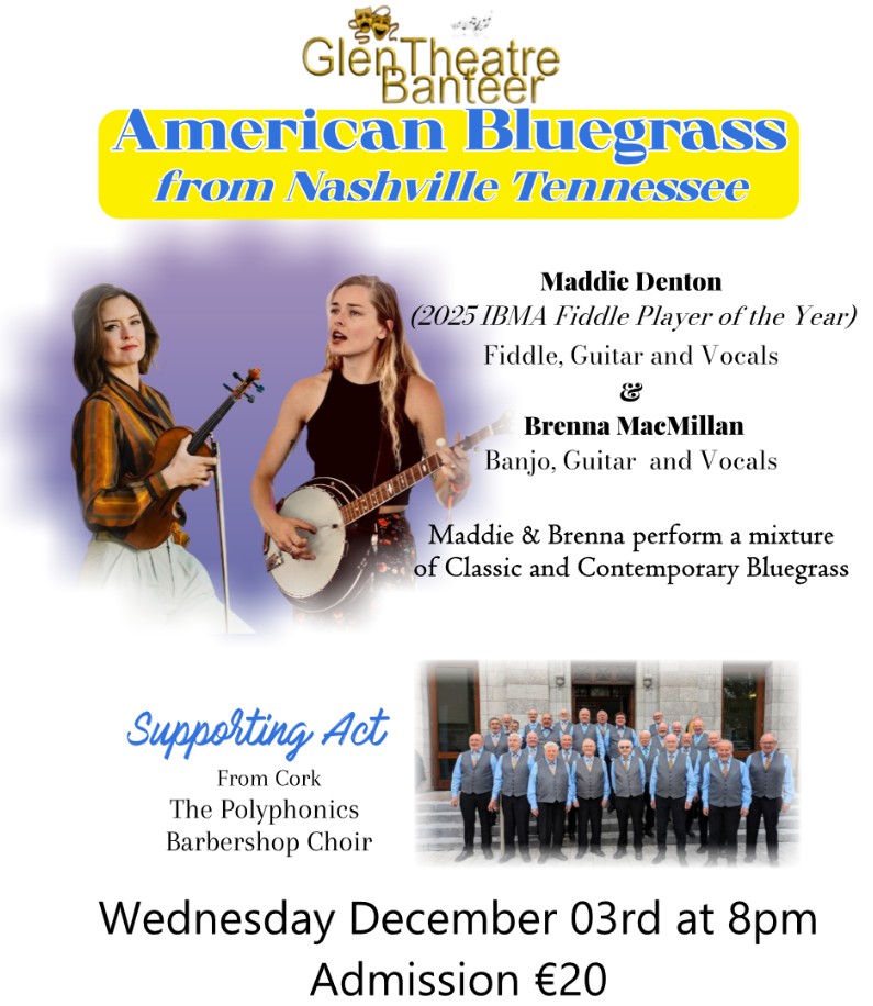 aWe are delighted to present on Wednesday 03rd December, from Nashville Tennessee, Bluegrass Duo Maddie Denton and Brenna MacMillan. Maddie, on Fiddle, Guitar and Vocals is the the 2025 IBMA Fiddle Player of the Year. Brenna, on Banjo, Guitar and Vocals is an accomplished singer/ song writer and was awarded the prestigious Red Foley Memorial award in 2018. Maddie & Brenna perform a mixture of Classic and Contemporary Bluegrass. The Supporting Act on the night will be the highly acclaimed Polyphonics Barbershop Choir. A great night’s entertainment is truly in store. The show commences at 8pm sharp and Admission is €20.
