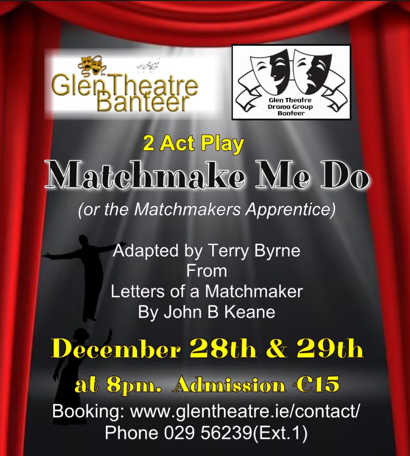 The Glen Theatre Drama Group Banteer brings to the stage, an adapted presentation of John B Keanes’ “Letters of a Matchmaker”. Adapted by Terry Byrne and Directed by Tadhg O’Keeffe “Matchmake Me Do” is a Two Act Comedy Play and will be performed in The Glen Theatre on the 28th and 29th December at 8pm each night. Tickets cost €15 and may be booked online at www.glentheare.ie/contact/ or by Phone 029 56239 (Ext.1)